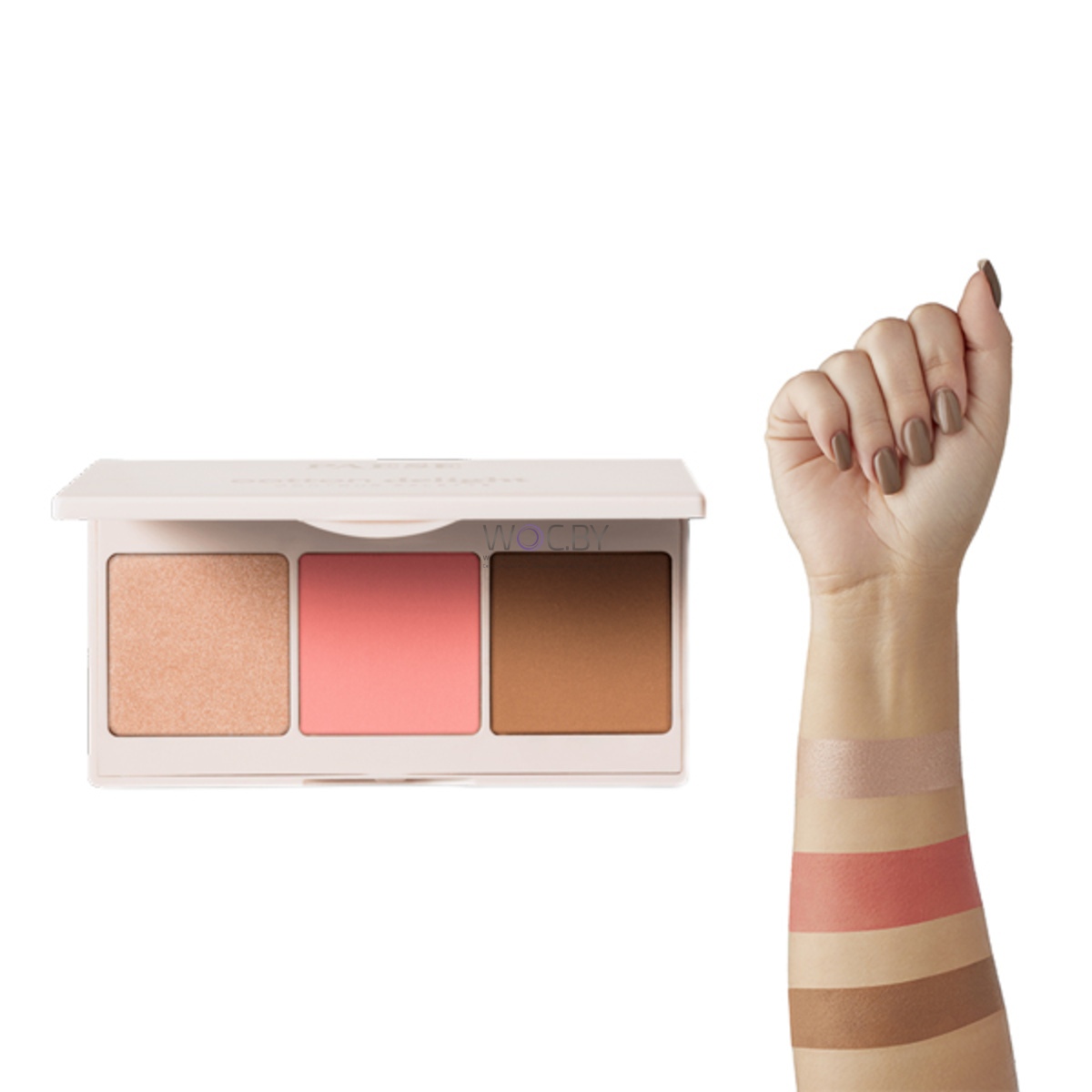 Палетка обладает веганской формулой и включает в себя три универсальных продукта для моделирования контура лица: хайлайтер, пудра и румяна, которые позволят подчеркнуть черты лица, придавая лицу сияние и свежий, отдохнувший вид. Продукт обладает превосходной стойкой пигментацией и бархатистой текстурой, которая мягко ложится на поверхность кожи и отлично растушевывается, что делает палетку идеальной для ежедневного использования, а также для макияжа на особые случаи. Превосходно подобранные цвета в наборах подойдут для придания лицу идеальных форм и очертаний и позволят создать полный макияж с помощью всего одного продукта! Палетка для контуринга поставляется в двух цветовых вариантах (холодный Pink 01 и теплый Peach 02), так что каждый может подобрать идеальный оттенок под себя. Активный ингредиент: Хлопковое масло - способствует укреплению естественного защитного барьера кожи, делая ее более упругой и гладкой. Обеспечивает бархатистую текстуру, что облегчает нанесение контуринга без образования пятен.